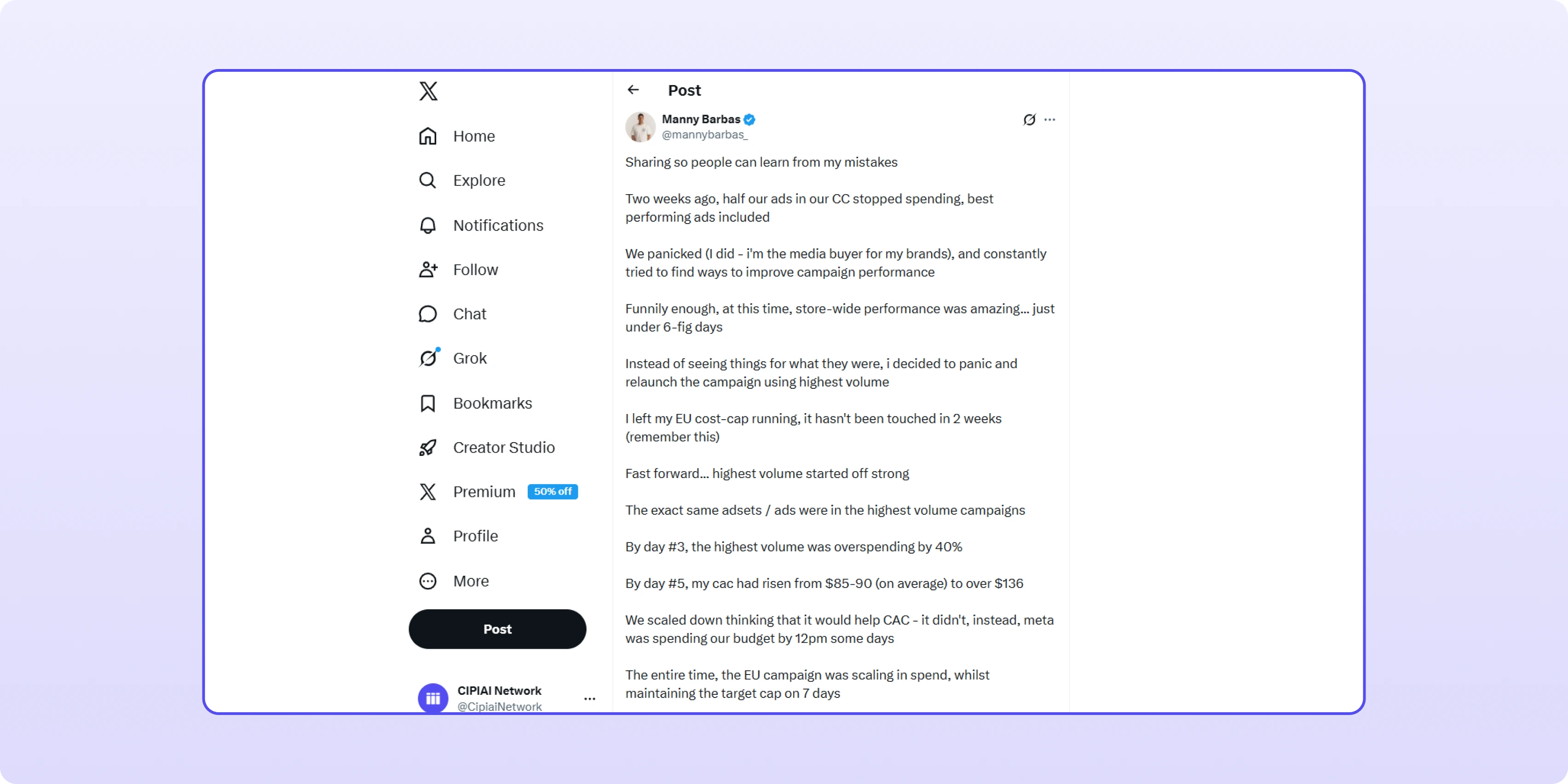 "I panicked when my ads stopped spending, relaunched campaigns, and ruined performance. When I left the cost-cap campaign untouched, performance normalized. Sometimes the best thing in marketing is to do nothing."