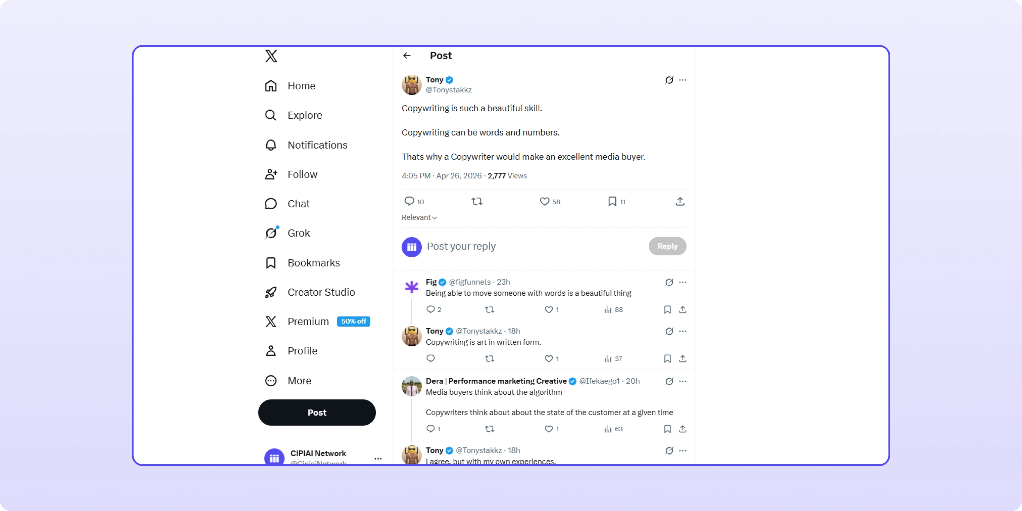 The core insight holds. Media buying at its core is about understanding human attention and decision-making - which is exactly what copywriting trains you for. The data layer (CPM, CTR, CVR) comes with practice. The intuition for what makes someone click? That's harder to teach, and copywriters often already have it.