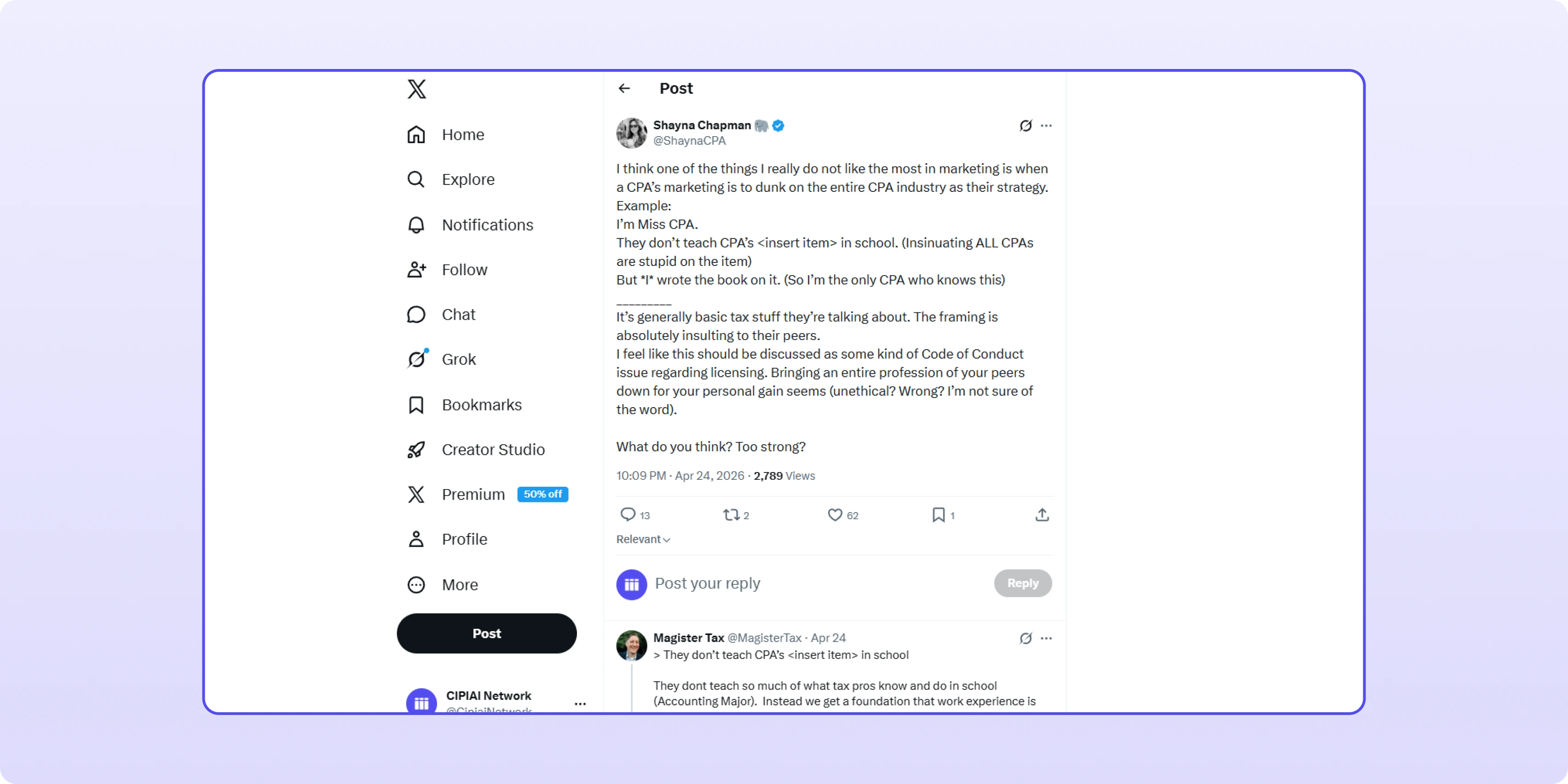 Short, direct, and accurate. The CPA space has a visibility problem - a lot of the loudest voices built their audience by attacking the industry they operate in. As the space matures, this approach is increasingly being called out. Worth keeping in mind if you're building a personal brand in this niche.