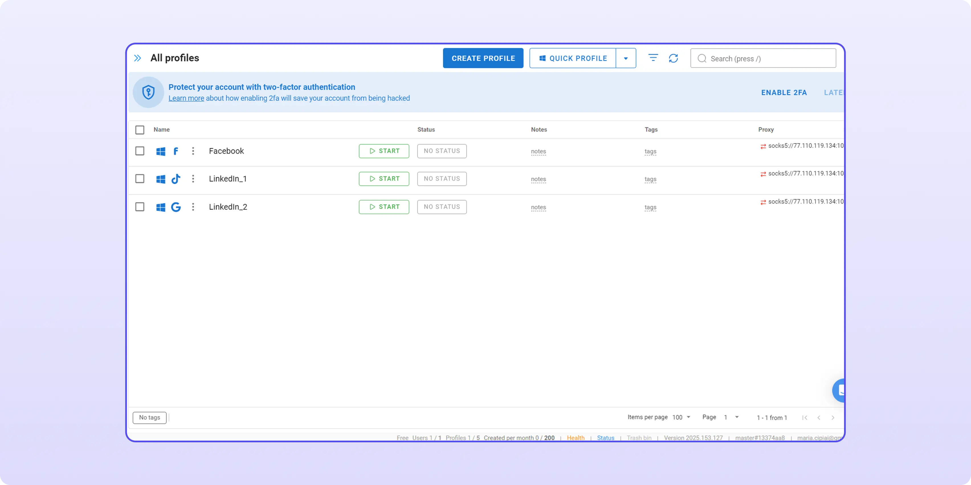 The interface of Dolphin Anty is another advantage. It’s clean, logical and fully customizable. You can adjust your workspace layout, choose what columns to display, tag profiles and assign notes or statuses to track account warm-ups, launches or active campaigns, add and edit proxies during profile creation or in the separate tab.