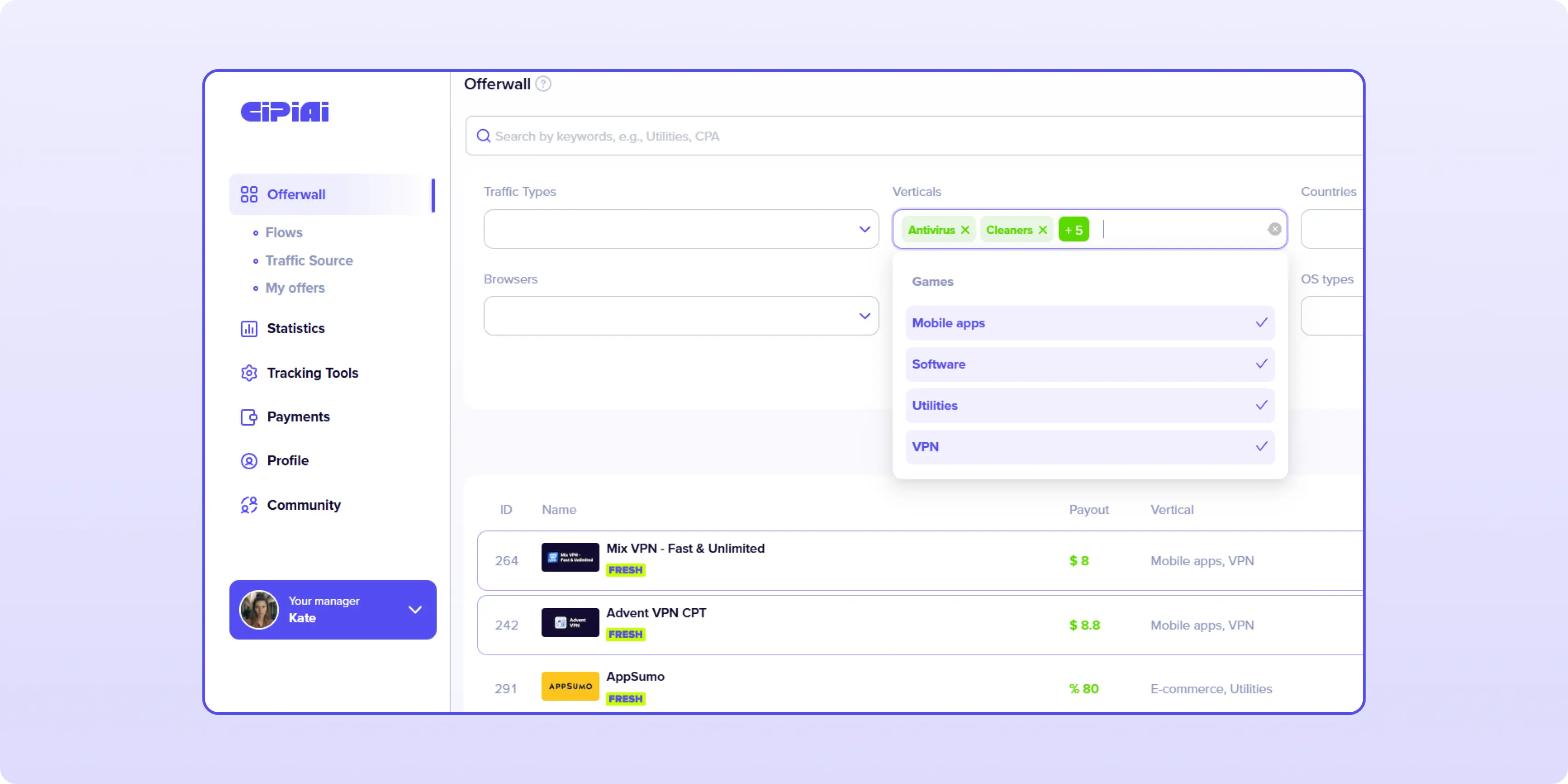 The best networks are those that provide direct offers, real-time optimization tools, and fraud protection. CIPIAI offers a curated Offerwall where you can filter by vertical, traffic type (Pop-under), and GEO — making it a reliable choice for affiliates and advertisers.